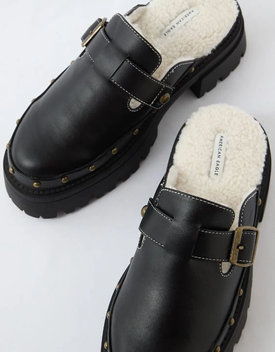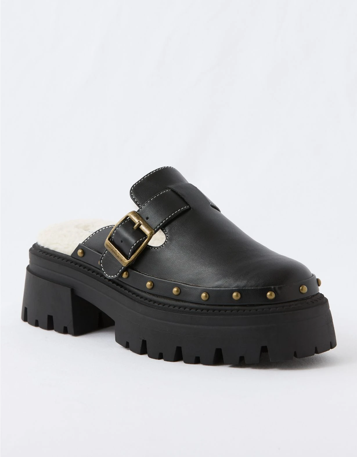 A sartorial clog in smooth vegan leather with cozy faux shearling & a chunky lug sole.