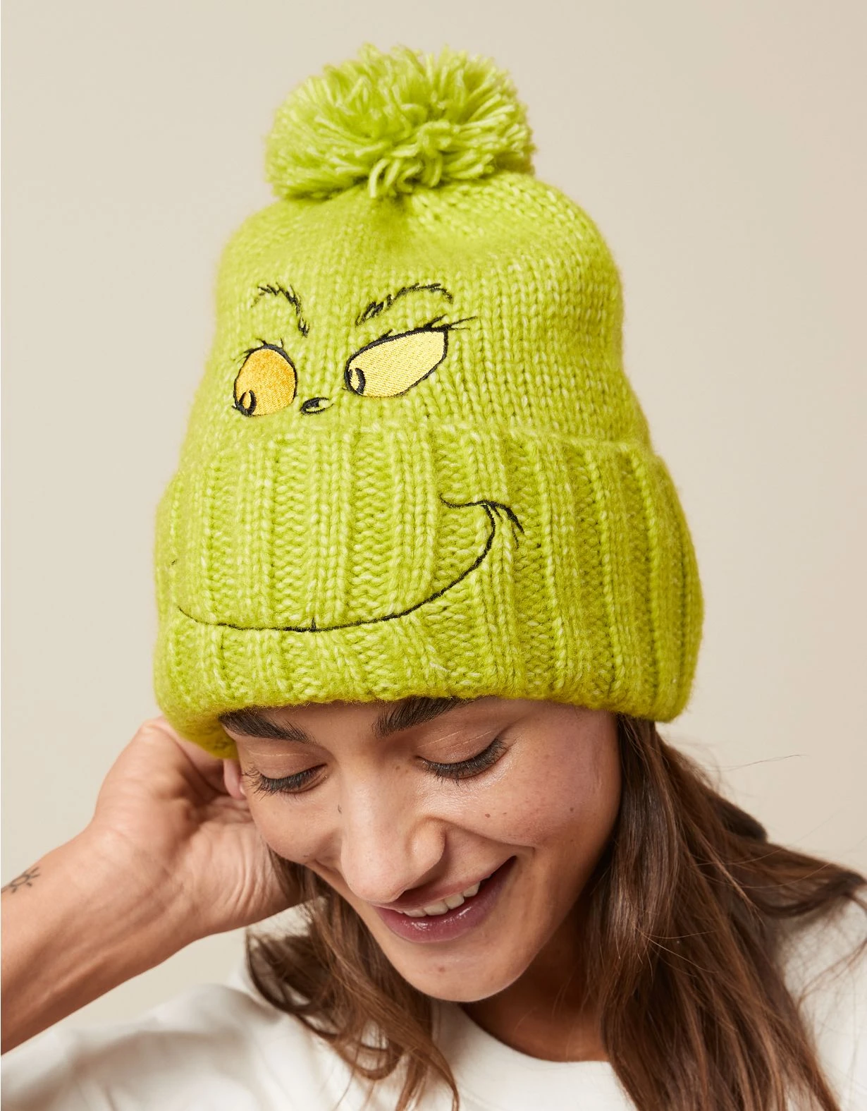 Head-to-toe comfy in this cozy Grinch knit beanie!