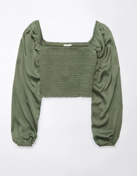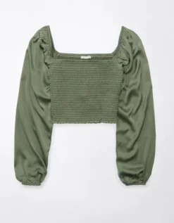 AE Smocked Satin Long-Sleeve Shirt